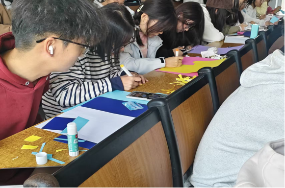 艺术疗愈系列活动为情绪表达开辟了无门槛通道。“心灵奇旅”艺术疗愈工作坊中,同学们在杂志、彩纸、布料等素材中自由“寻宝”,通过裁剪重组完成专属“心灵拼贴画”,将说不出口的情绪转化为直观的图像语言,在创作中获得放松与疗愈。