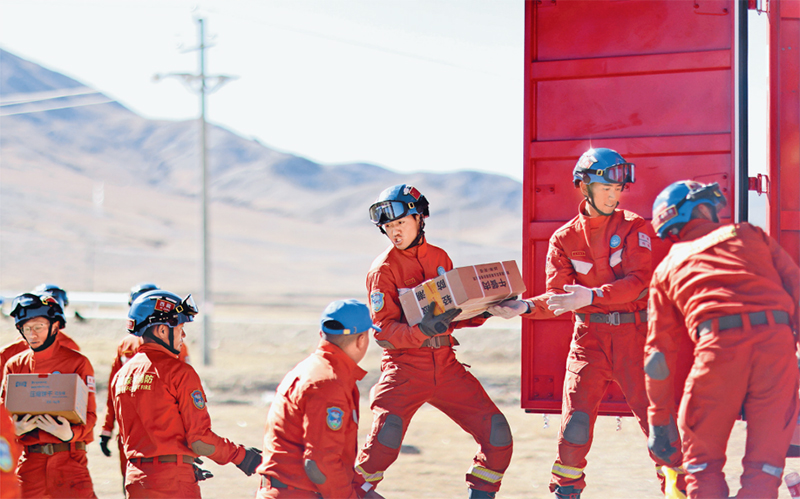 新时代以来,广大青年在抢险救灾前线冲锋陷阵,在党和人民最需要的时刻冲得出来、顶得上去,展现出自信自强、刚健有为的精神风貌。2025年1月7日,西藏自治区日喀则市定日县发生6.8级地震。图为1月9日西藏自治区森林消防总队派出的救援人员在地震重灾区日喀则市拉孜县拉孜镇措布村卸载救灾物资。 新华社记者 姜帆/摄